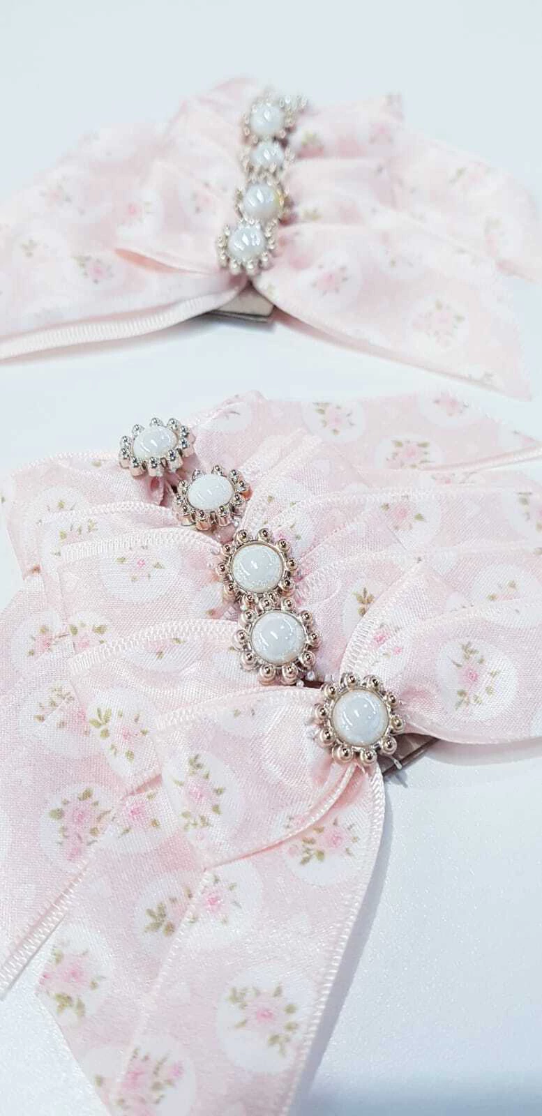 Lacinhos de fita tamanho aprox 6cm de largura, feitos em fita decorada e cetim com aplicações diversas como renda, pérolas, strass, etc... Amarração com borrachinha ( elástico ), no modelo Laço de Ponta.