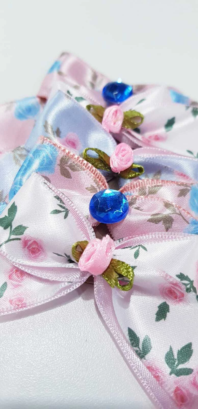 Lacinhos de fita tamanho aprox 6cm de largura, feitos em fita decorada e cetim com aplicações diversas como renda, pérolas, strass, etc... Amarração com borrachinha ( elástico ), no modelo Laço de Ponta.
