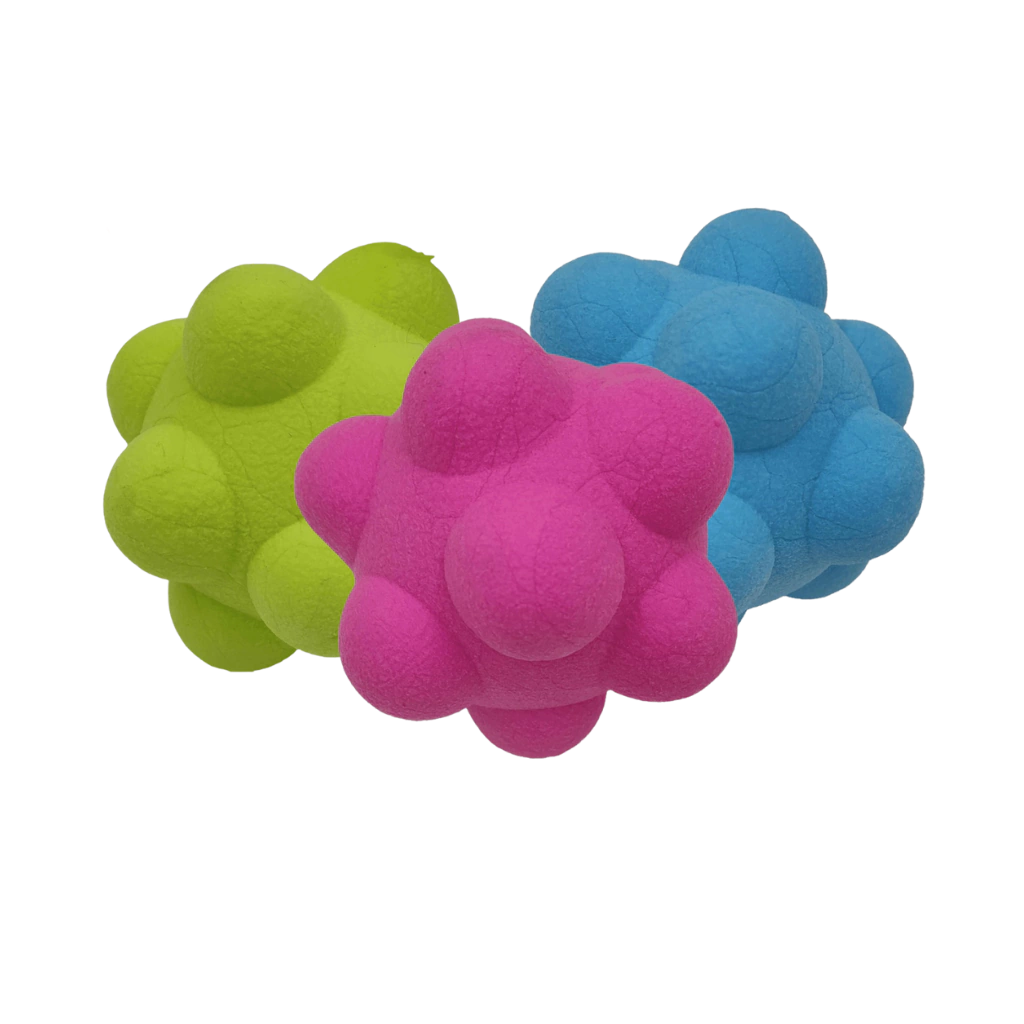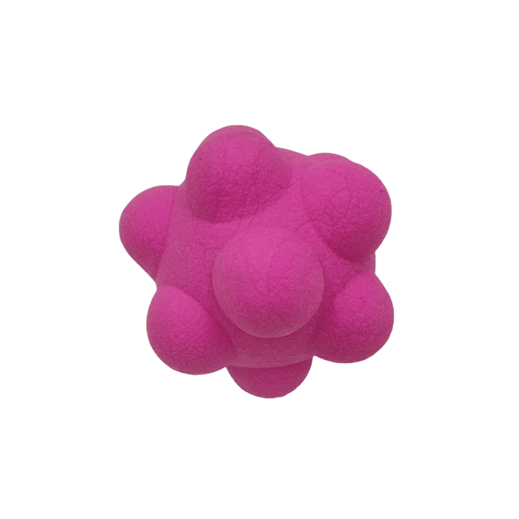 Quando você joga no chão ela não rola em linha reta como uma bola comum. Ela quica para lados aleatorios, aumentando o nivel de dificuldade da brincadeira, estimulando a diversão.